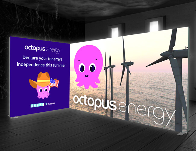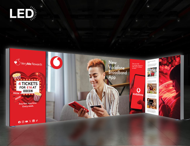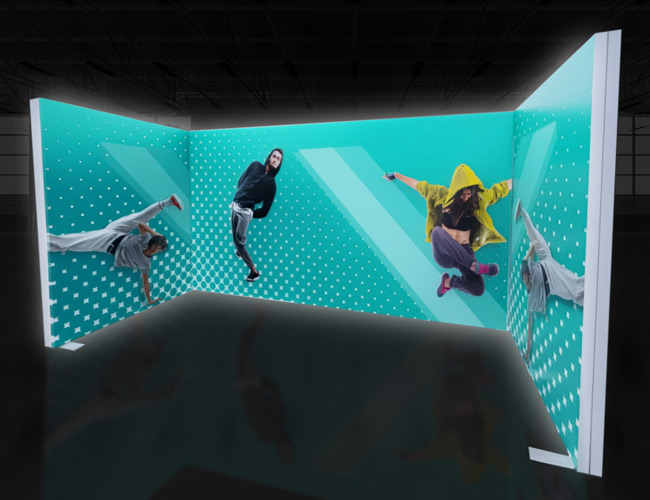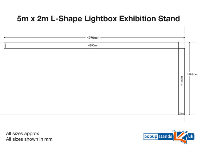 A visually striking and impactful 5m x 2m corner lightbox exhibition stand, approximately 5m wide and 2m deep. It is designed for use in space-only areas or within an allocated shell scheme. The stand is covered with vibrant, full colour stretch fabric graphics on both the front and rear, making it ideal for corner booths as it maximises brand exposure from all angles.