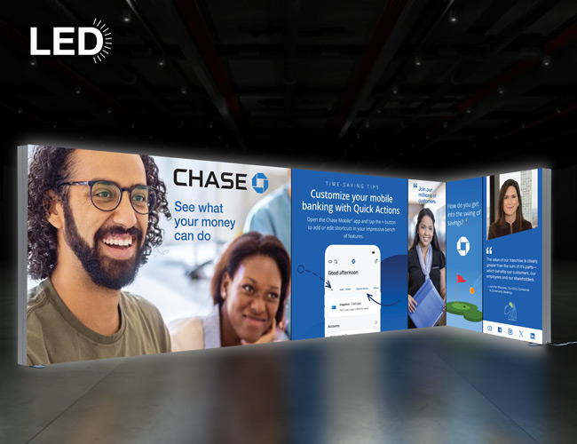 For a 6m x 2m (12sqm) shell scheme or space-only areas, this illuminated corner exhibition lightbox stand incorporates slimline structures, discreet 90-degree corner connectors and ultra-bright pre-fitted LED lighting. Depending on the available space, you can rearrange and reconfigure this high-end and cutting-edge conference stand to create T-shapes, U-shapes, or straight backwalls!